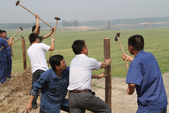 上午9时整,该矿调度指挥中心发布广播,泗水位超过警戒水位,9时3分参加演练人员集合完毕。9时8分,参演人员将防汛物资装车,9时20分到达泗河大堤。防汛指挥部现场组根据实际情况,当场制定抢险方案。抢险队员根据制定的措施,分组打桩,抬土。演练过程中,共打木桩2排25根,用时18分钟;装沙50筐,用时20分钟;连木桩