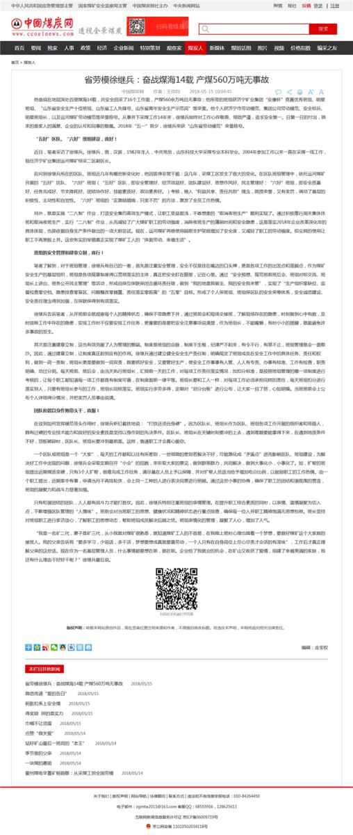 《中国煤炭报》官网 2018年5月15日 “煤炭人”专栏头条: